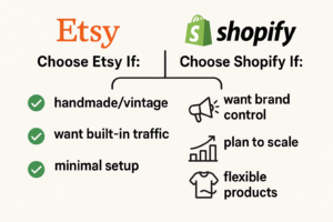 It is also important to remember that choosing a platform is never set in stone. In fact, many businesses start with Etsy, then transition to Shopify once they are ready to expand into a more advanced setup. What matters most is simply getting started and staying flexible as you learn the ropes.